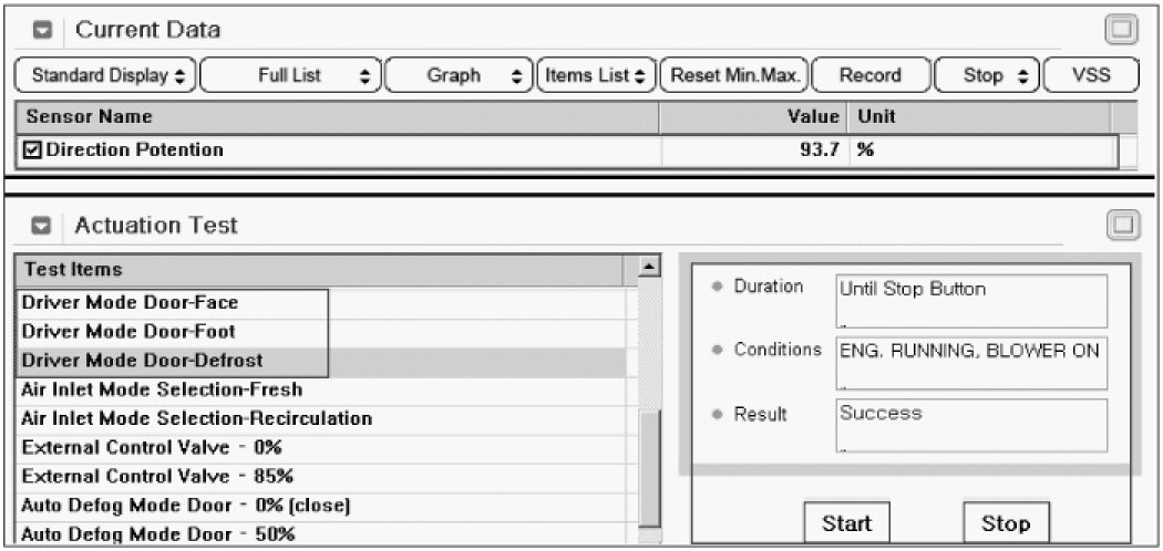 4. Select and perform Actuation test Driver Mode Door - Face / Foot / Defrost in order.