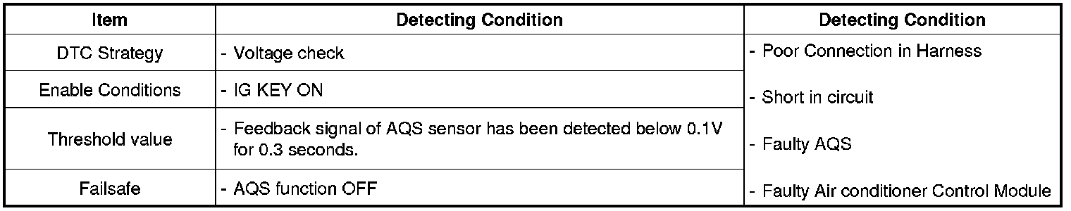 Air conditioner Control Module sets DTC B1258 if Feedback signal of AQS sensor has been detected below 0.1 V for 0.3 seconds.