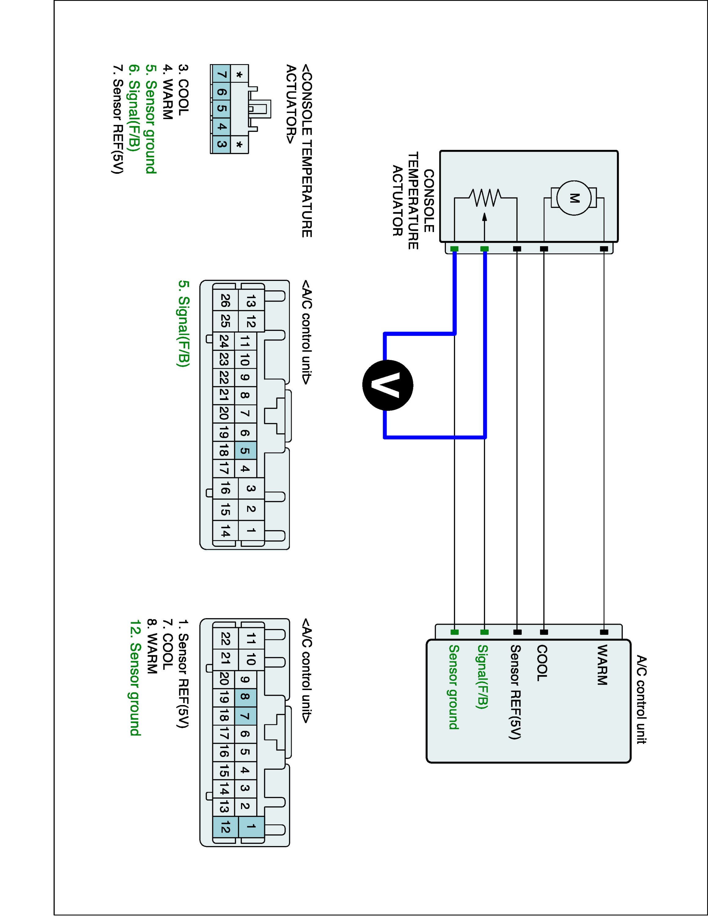 4. Measure voltage between Signal (F/B) terminal of Console temp actuator harness connector and Sensor ground (-) terminal of A/C-ECU harness connector. (Component side)