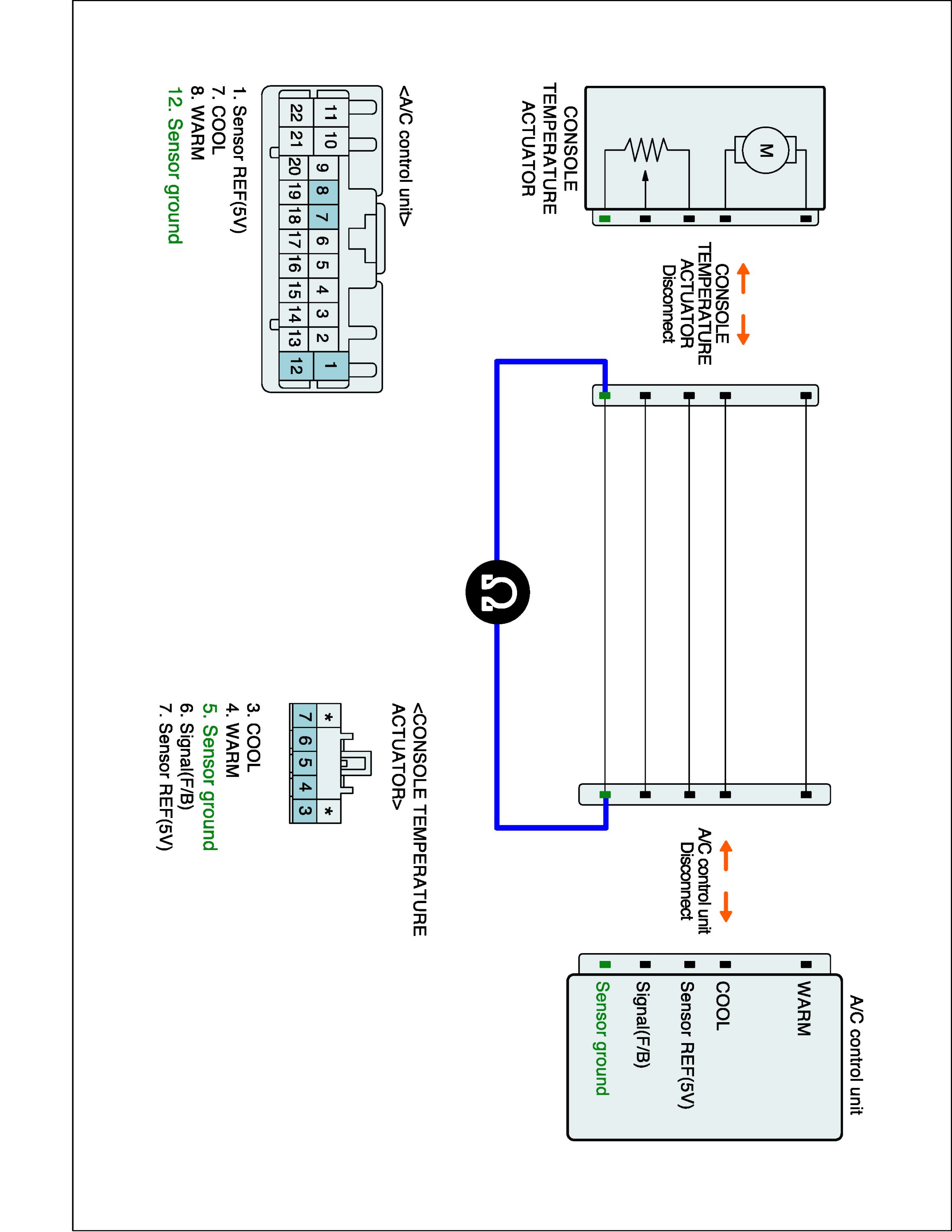 3. Measure resistance between Sensor ground (-) terminal of Console temp actuator harness connector and Sensor ground (-) terminal of A/C-ECU harness connector.