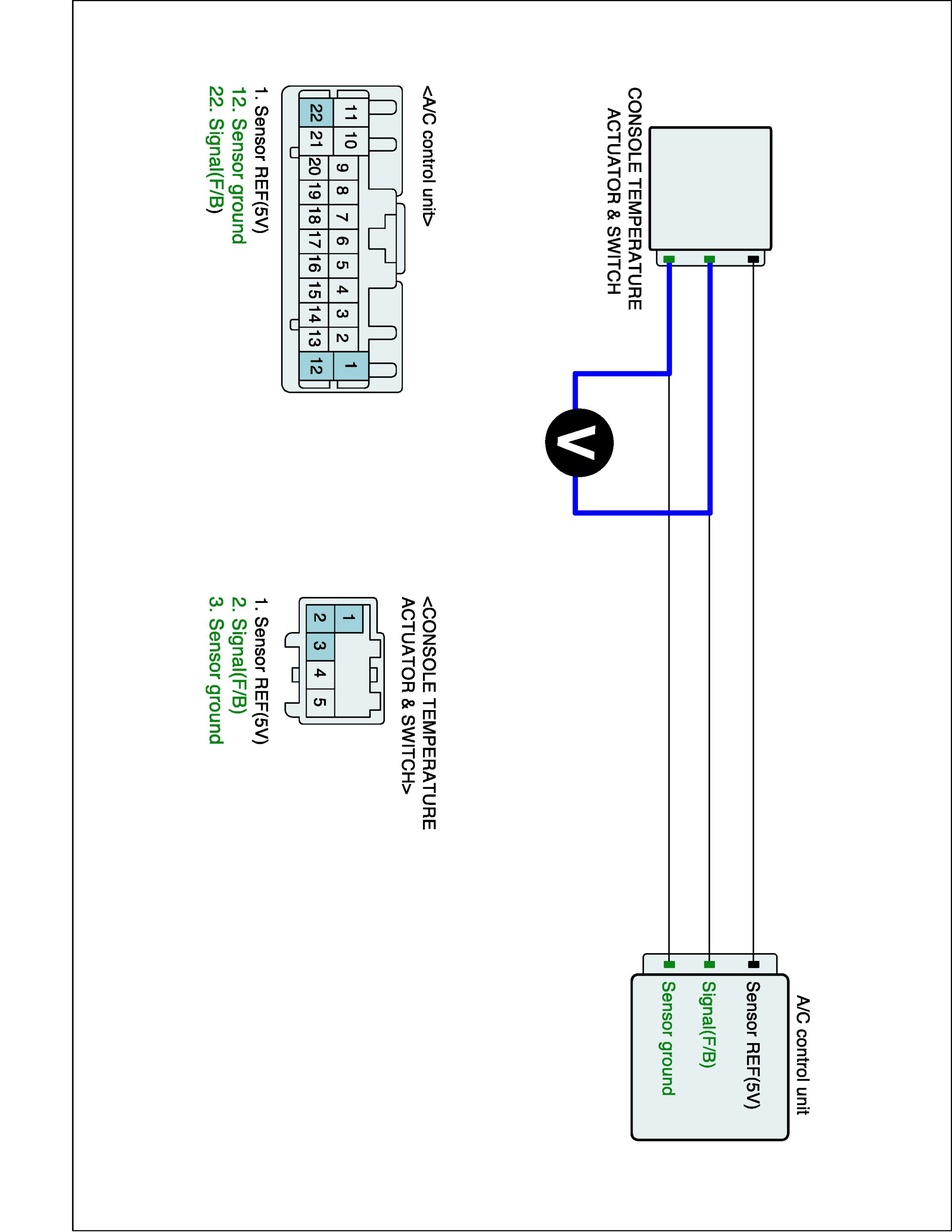 4. Measure voltage between Signal (F/B) terminal of Console temperature actuator & Switch harness connector and Sensor ground (-) terminal of A/C-ECU harness connector. (Component side)