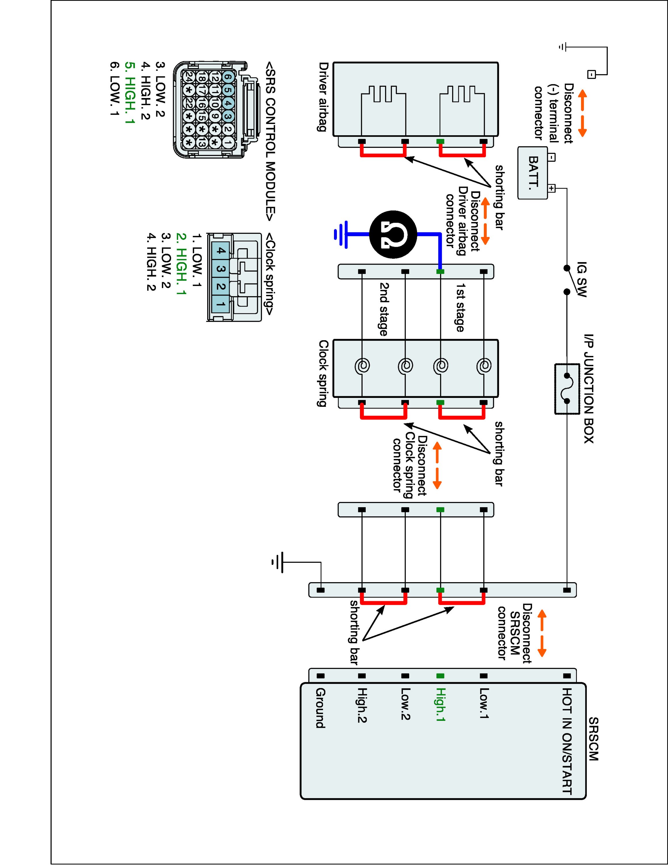 4. Measure resistance between terminal "Low.1" or "High.1" of the clock spring harness connector and chassis ground.