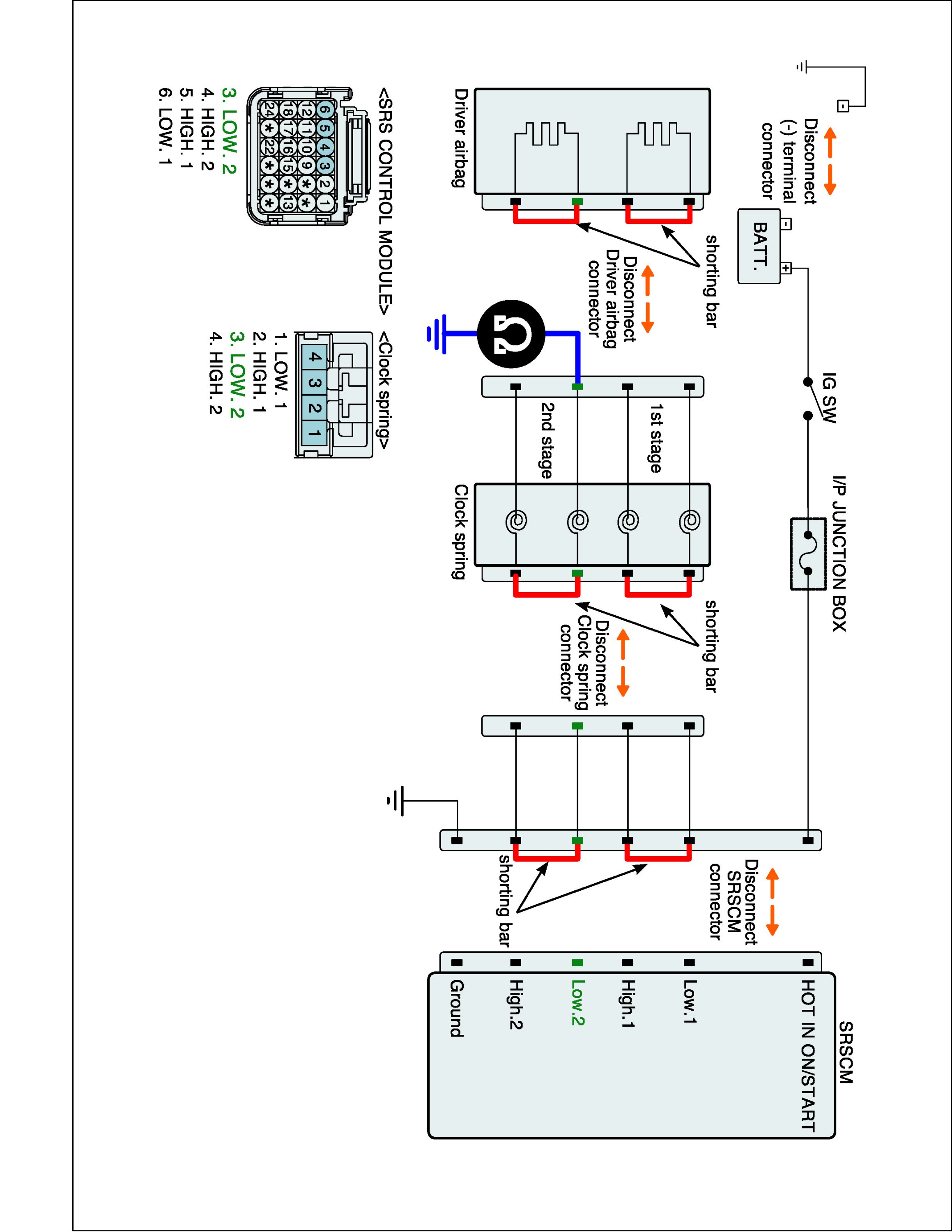 4. Measure resistance between terminal "Low.2" or "High.2"of the clock spring harness connector and chassis ground.
