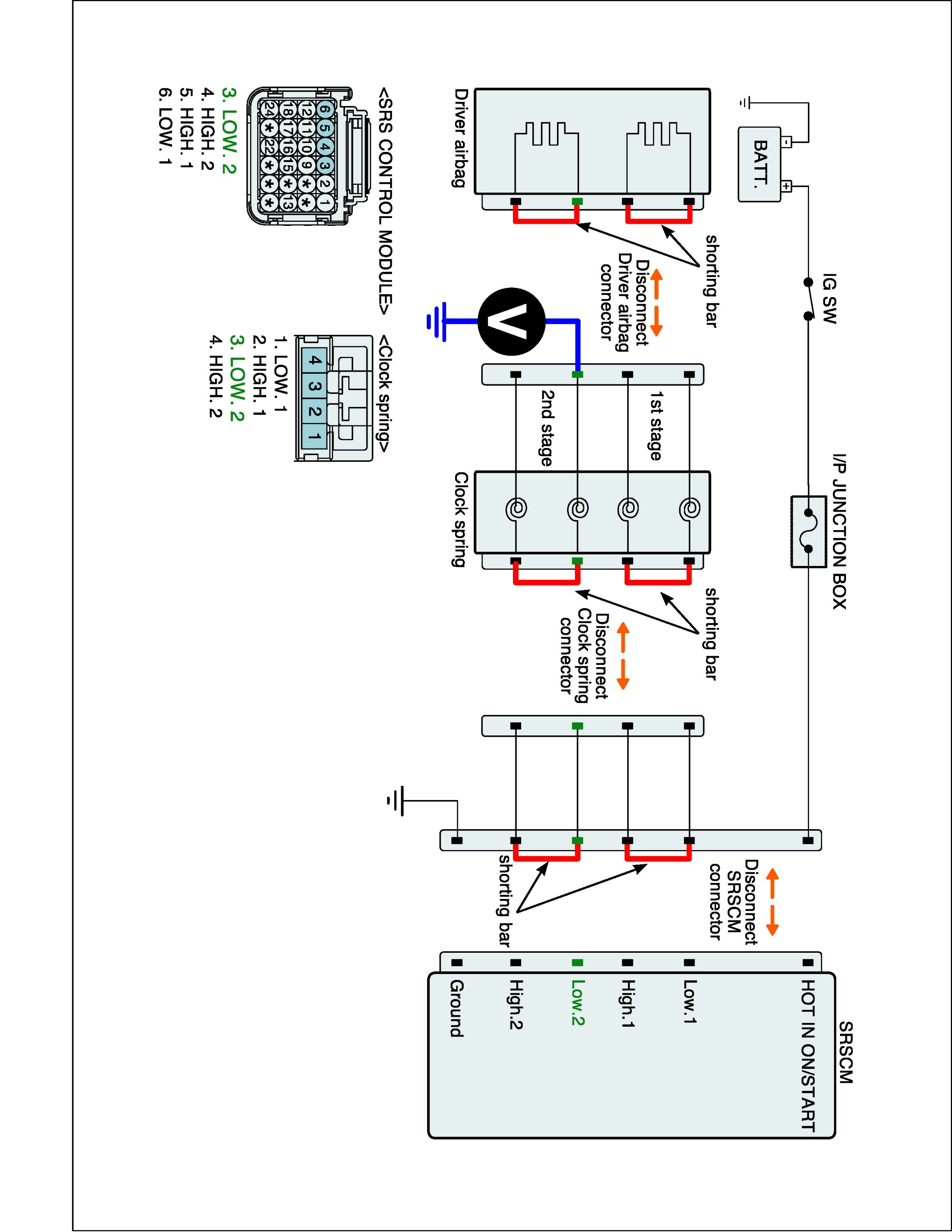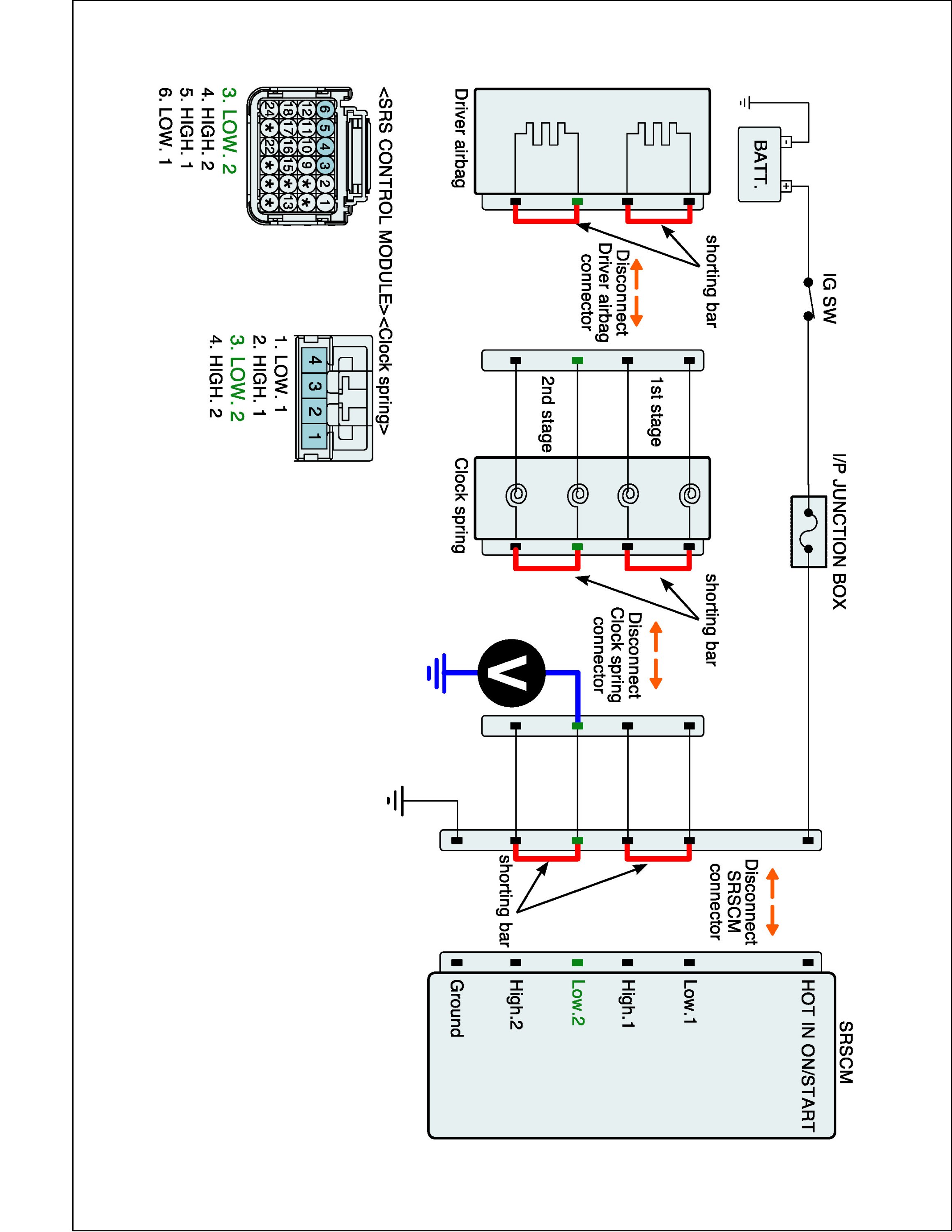 5. Measure Voltage between terminal "Low.2" or "High.2" of the clock spring harness connector and chassis ground.