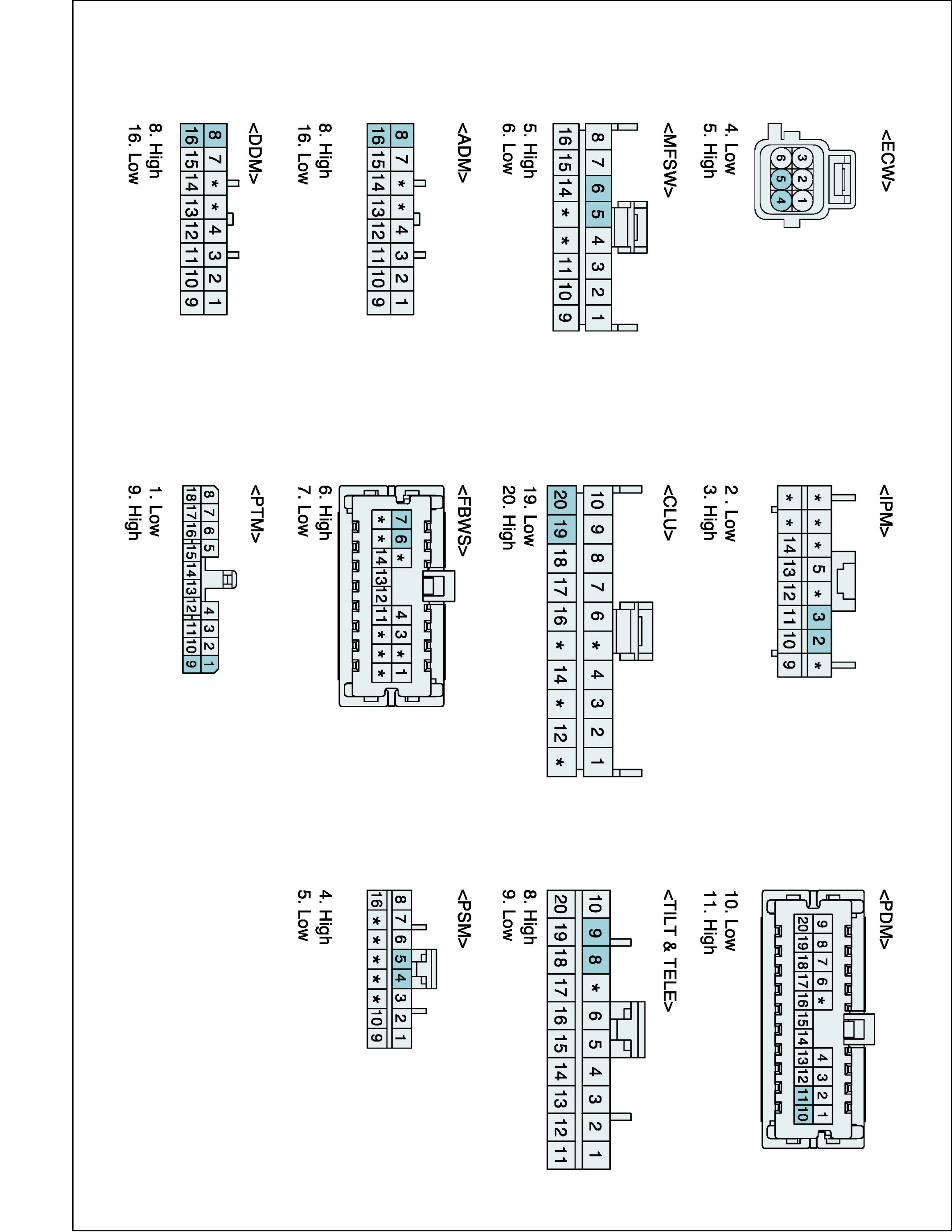 They are IPM (Inter Panel Module), FAM (Front Area Module), PDM (Power Distribution Module), DDM (Drive Door Module), ADM (Assist Door Module), ECW (Electronic Control Wiper), CLU (Cluster), MFSW (Multi Function Switch), PSM (Power Seat Module), SCM (Steering Control Module), PTM (Power Trunk Lid Module), FBWS (Front Back Warning System), DATC (Dual Auto Temperature Control Module).