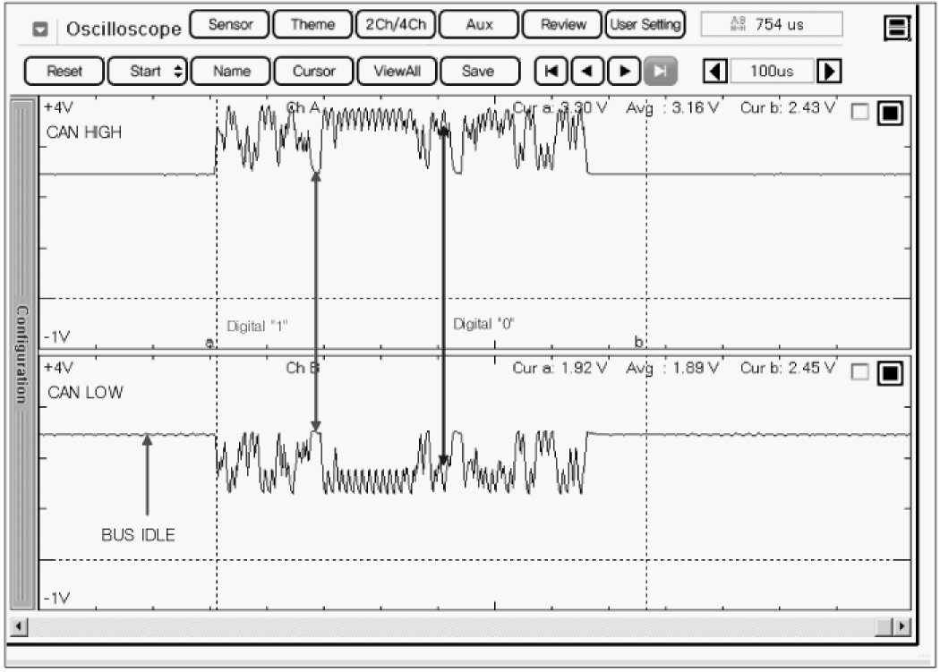 3. Connect 2 channel scope to DLC CAN HIGH terminal and CAN LOW terminal.