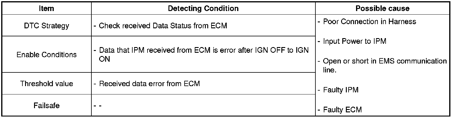 IPM sets DTC B1625 if Data from ECM is error such as check sum error, Data Frame error, ID Unknown error, Data length error and Time out error.