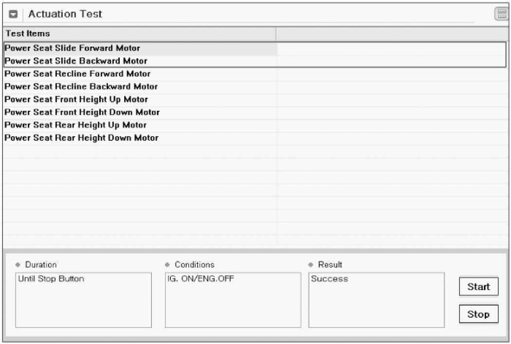 4. Execute "Seat Slide Motor (FORWARD, BACKWARD)" test.