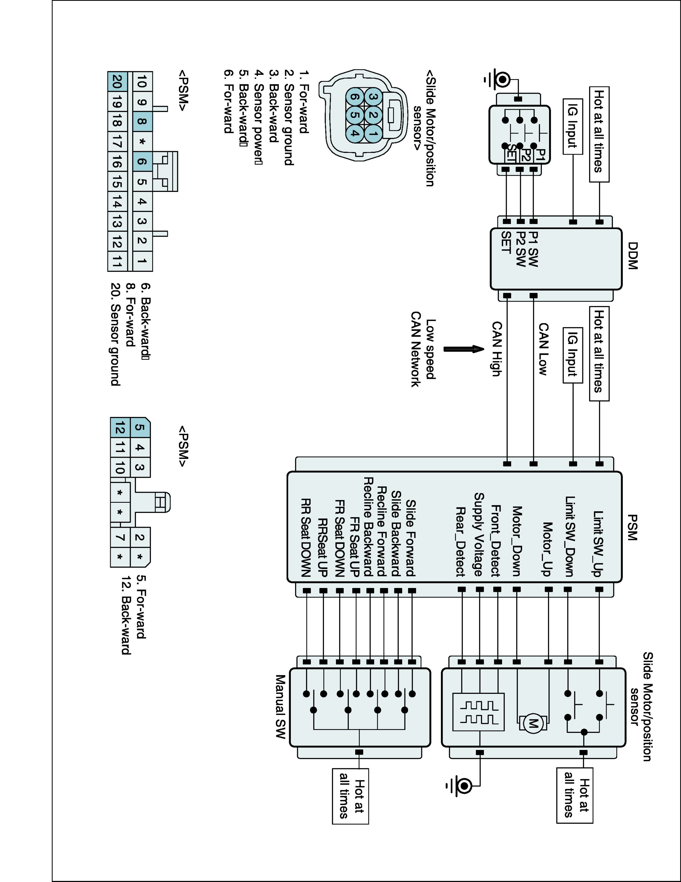 PSM sets this code when amount of change of the Slide motor position sensor is little than 12edge (6pulse) for 2 sec. This means that Slide motor/sensor stuck due to open or short in circuit or external cause (compulsive restriction)