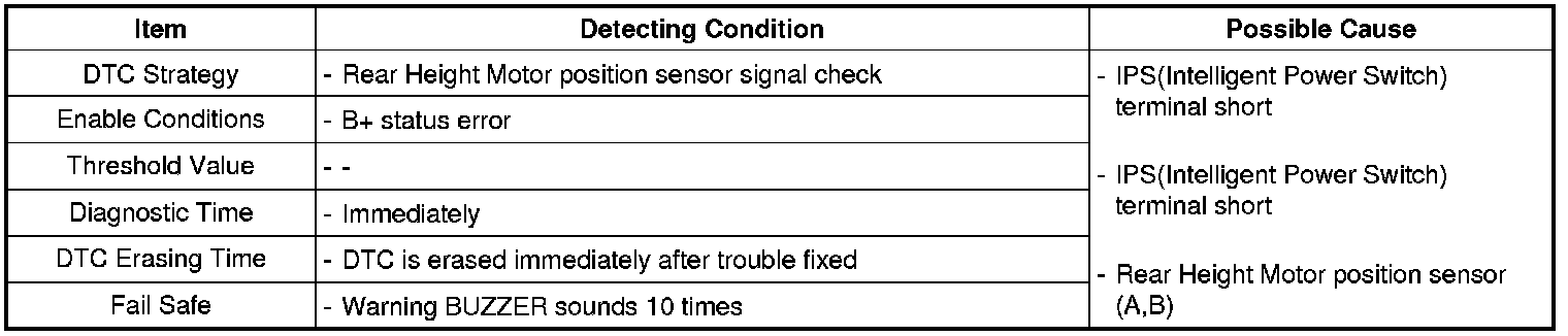 PSM sets this code when amount of change of the Rear height motor sensor is little than 8edge (4pulse) for 1 sec. This means that rear height motor/sensor stuck due to open or short in circuit or external cause (compulsive restriction)