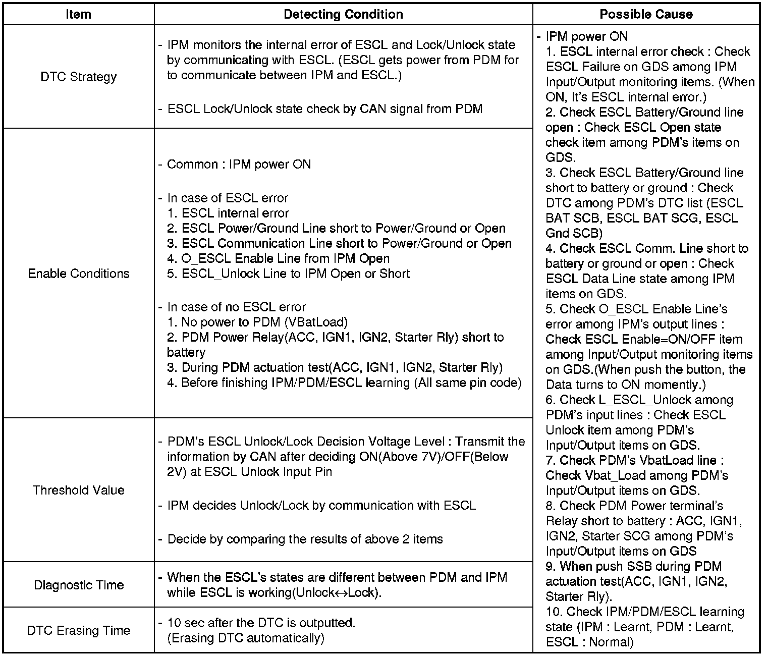 The steering wheel's Lock/Unlock state from ESCL (Electronic Steering Column Lock) and the related data to starting from EMS are sent to IPM by the serial communication line.