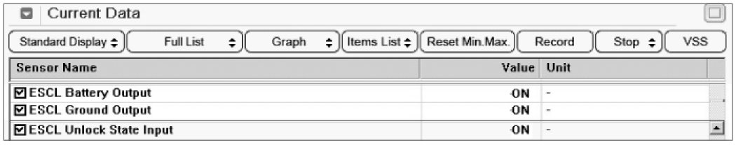 4. Monitor "ESCL BATTERY OUTPUT", "ESCL GND OUTPUT" and "ESCL UNLOCK STATE INPUT" are normal