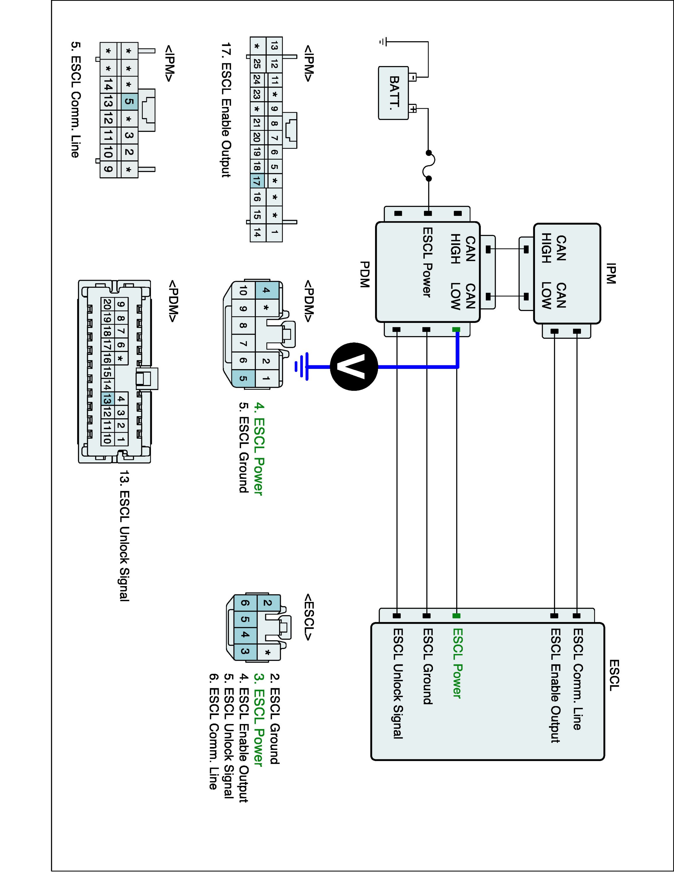 2. Measure voltage between ESCL power terminal of PDM and chassis ground.
