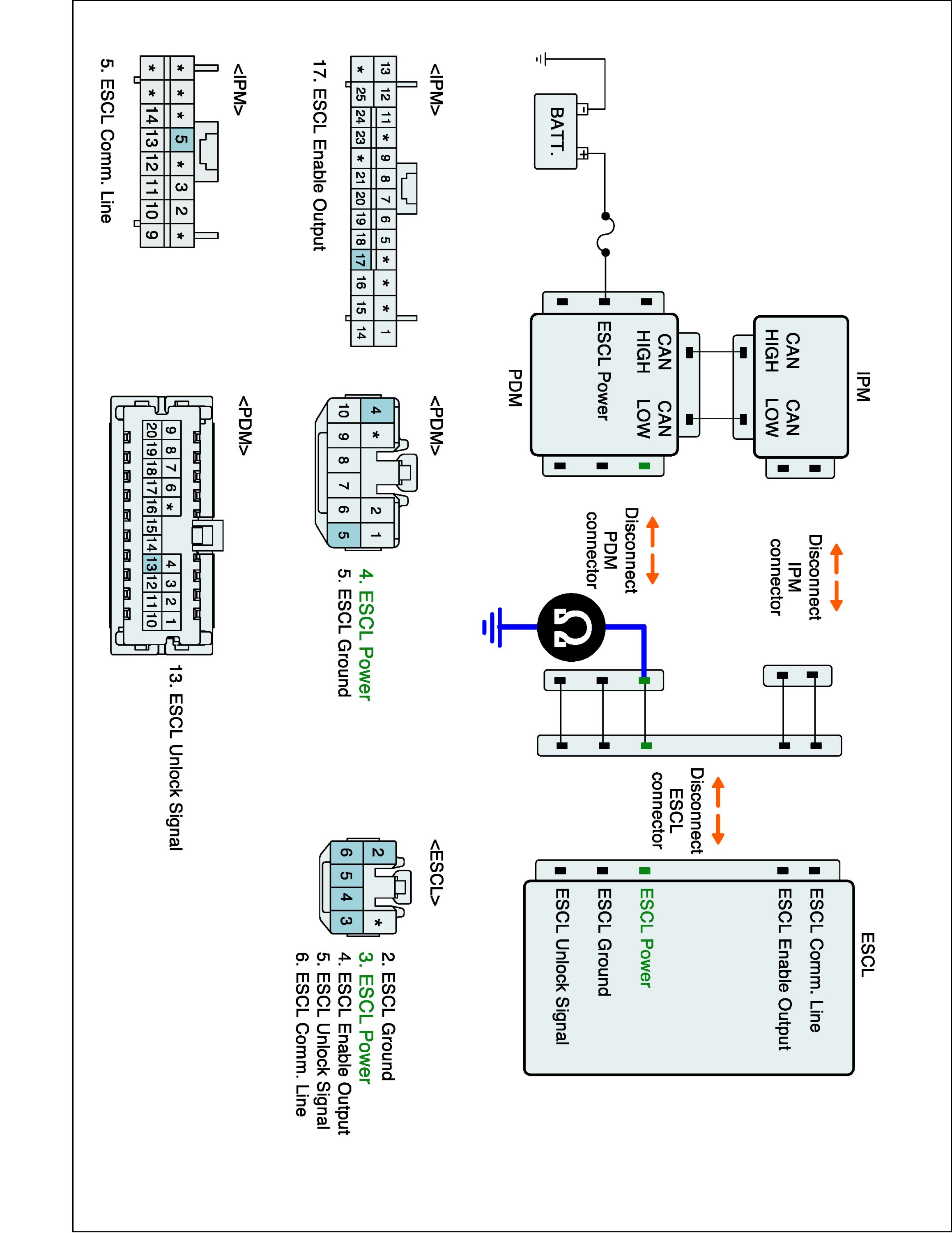 2. Disconnect the connectors of IPM, PDM, ESCL.