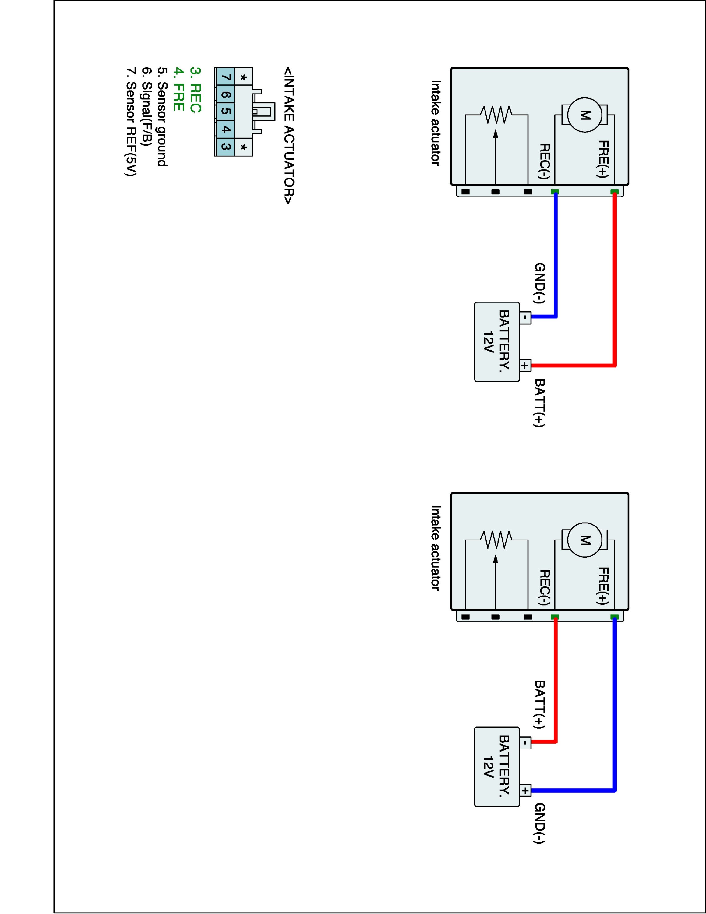 3. Connect (+) terminal of battery to FRE (+) of intake actuator and (-) terminal to REC (-). (Component side)