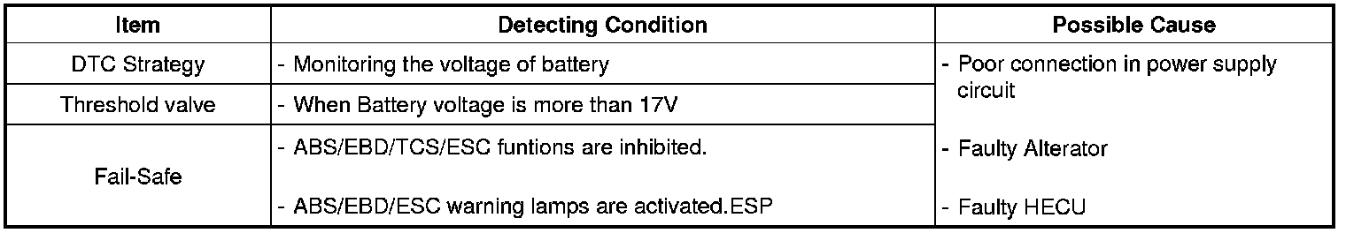 The HECU monitors the voltage of battery and if it stays more than 17 Volts, this DTC is set.