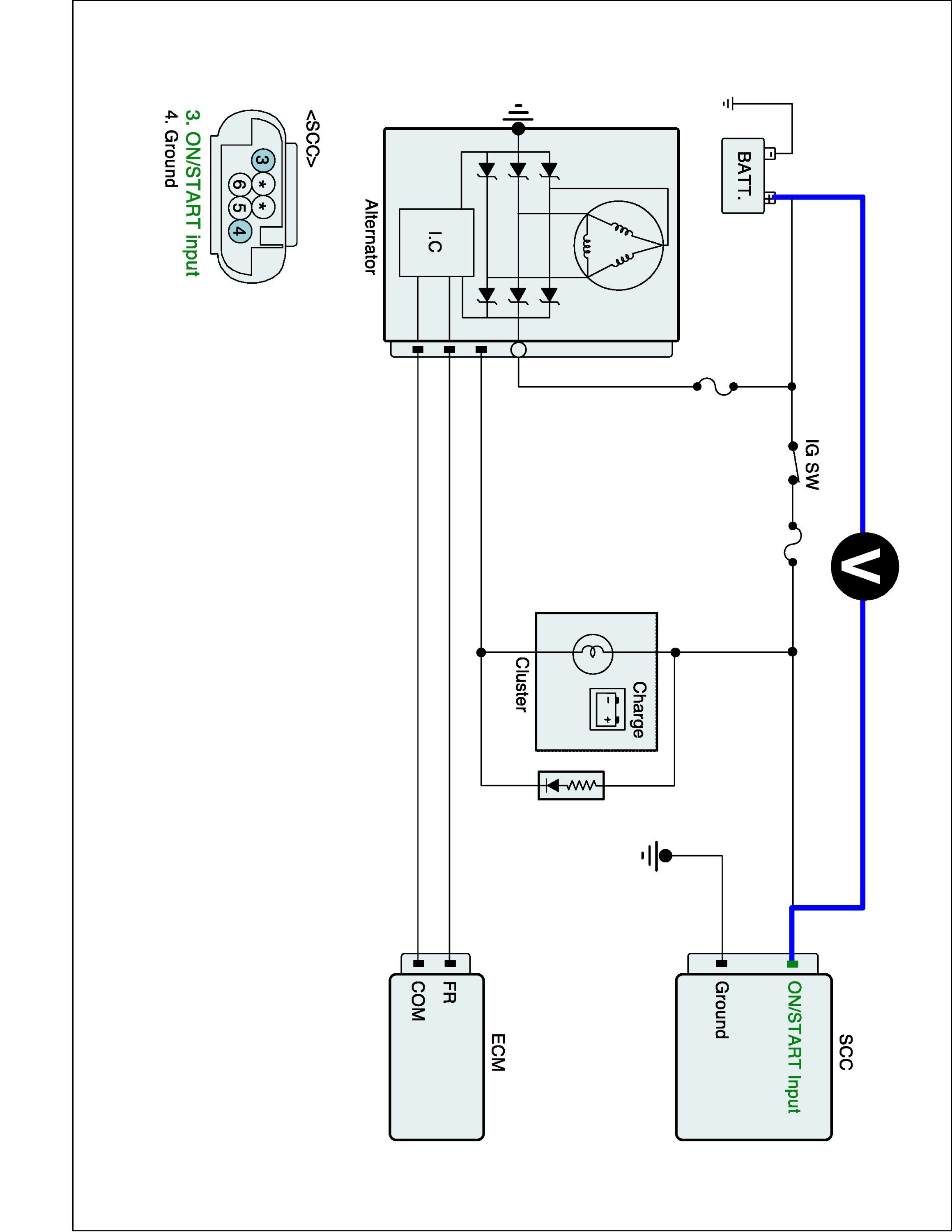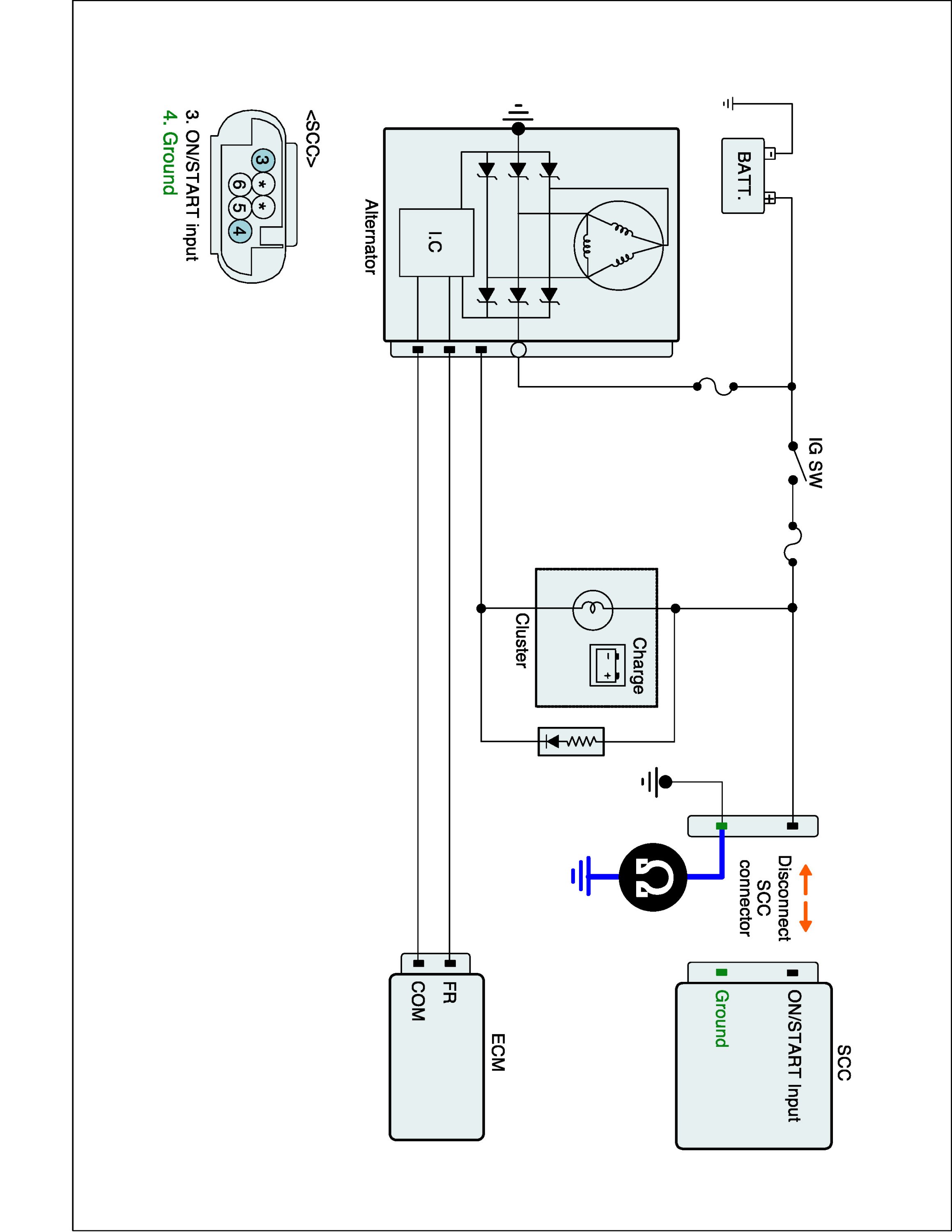 2. Measure the voltage between on/start input terminal of SCC and B terminal of alternator.