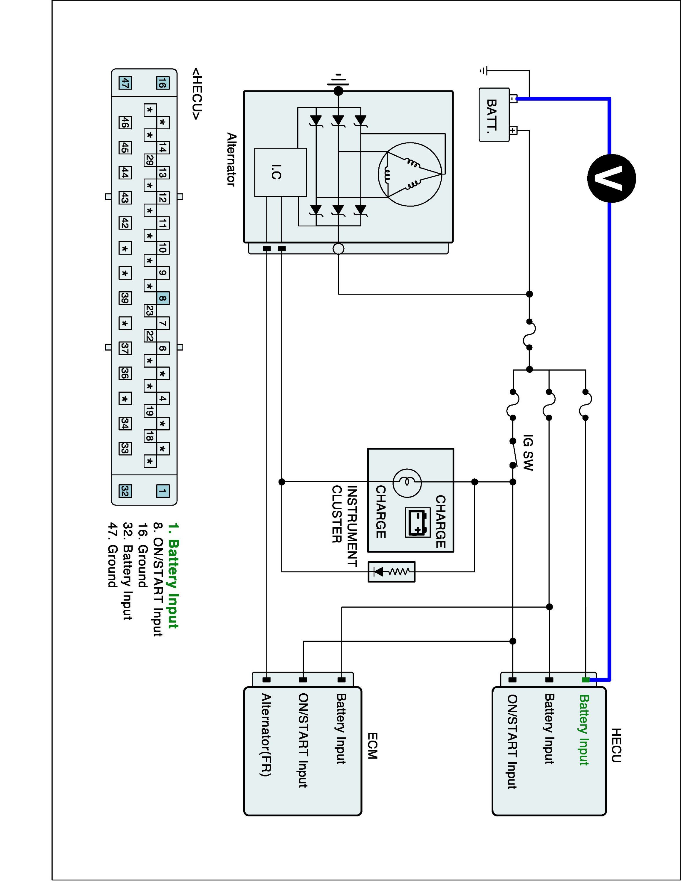 2. Measure voltage between the battery terminal (+) and power terminal of the HECU harness connector.