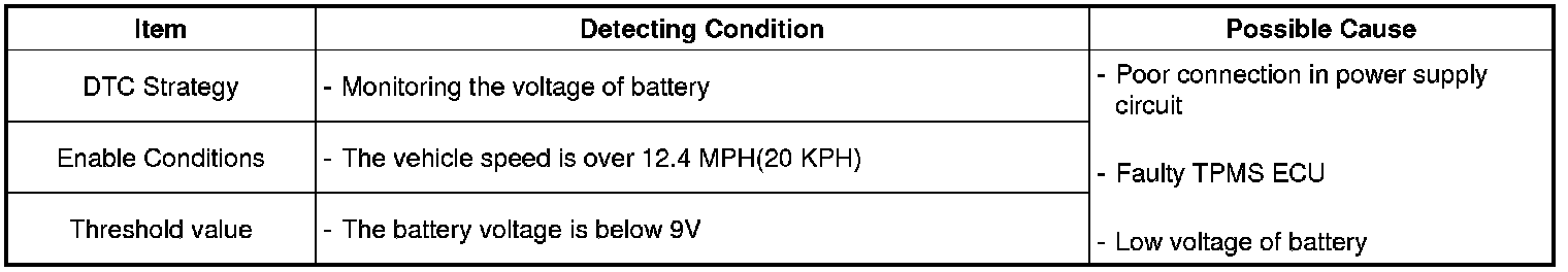 The TPMS ECU monitors the voltage of battery and if it stays below a certain value, this DTC is set.