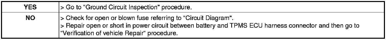3. Measure resistance between ground terminal of the TPMS ECU harness connector and chassis ground.