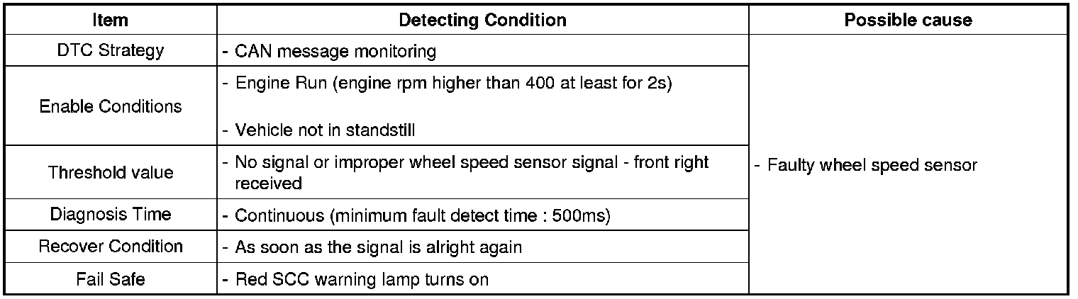 SCC monitors wheel speed sensor signal with every reception of the CAN message. SCC sets this code when there is no WSS signal or SCC detects improper WSS signal. System recovers to normal condition as soon as the signal is alright again.