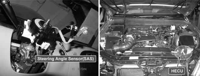 The slit plate, which has 45 holes, is installed between LED and photo transistor, and generates signals if the slit plate rotates according to the steering wheel rotation. The steering angle sensor's signals are generated by photo transistor which is driven whenever the light passes through the holes. The HECU receives the steering signals from steering angle sensor by CAN communication and detects the operating speed and the direction of the steering wheel.