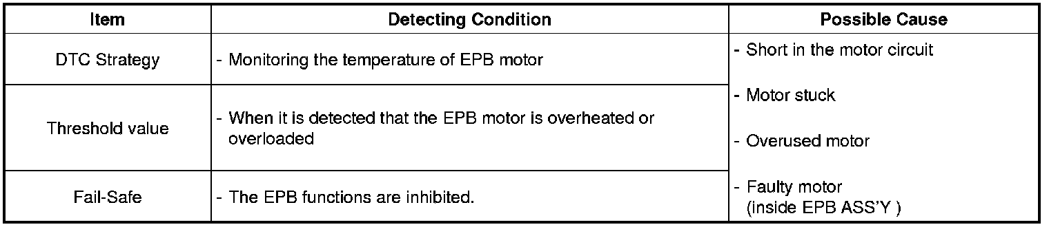 The EPB ECU monitors the temperature of the EPB motor and if it is detected as overheated or overloaded, this DTC is set.