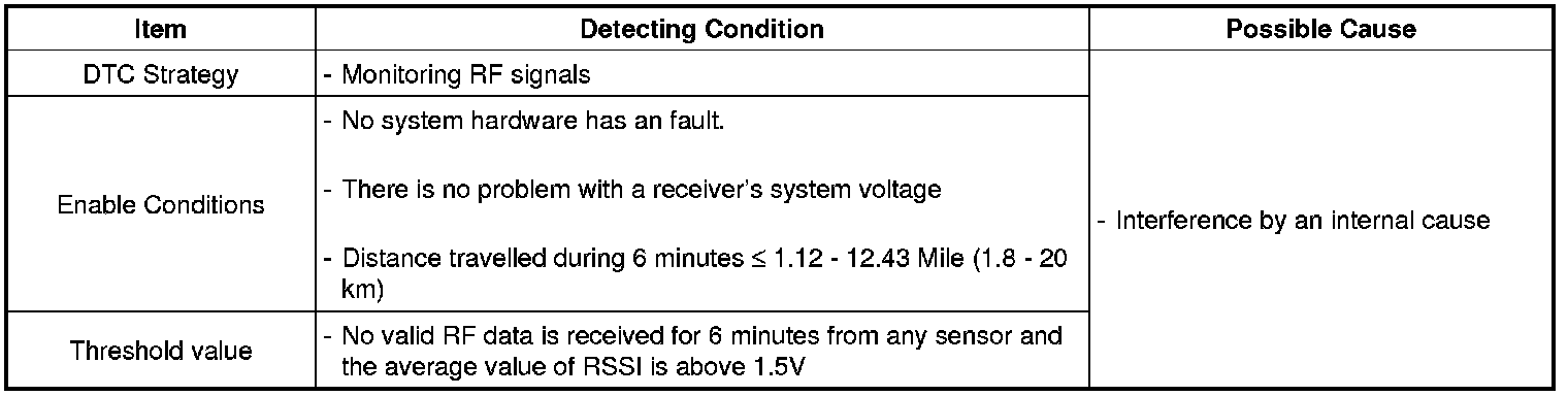 The TPMS ECU monitors RF signals of TPMS sensor and if the TPMS ECU does not receive a valid signal from the sensor by an internal interference, this DTC is set.
