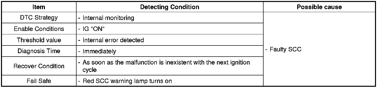 SCC sets this code when SCC detects internal error. System recovers to normal state if the SCC is alright again with next ignition cycle.