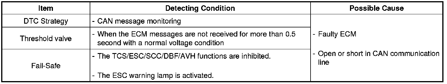The HECU checks the CAN communication lines for normal control and if an ECM message is not received for a certain period, this DTC is set.