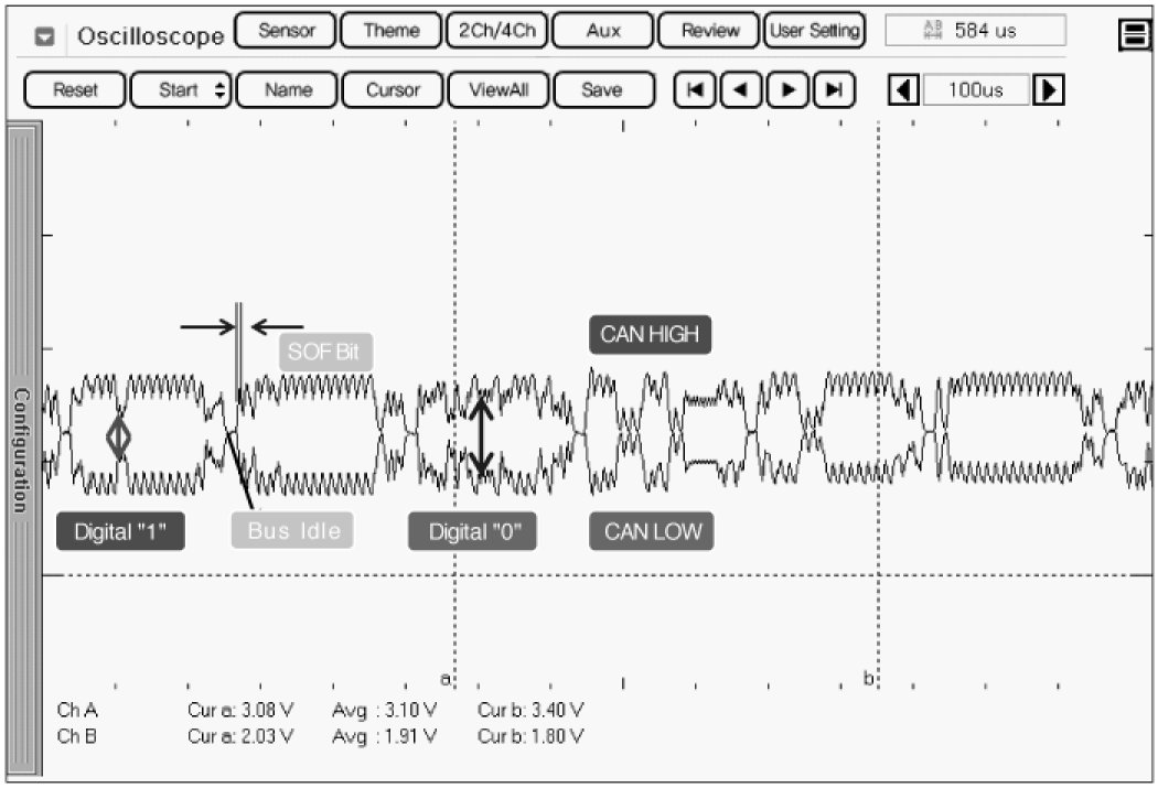 Monitoring CAN HIGH and LOW simultaneously is important in monitoring CAN communication waveform. When CAN HIGH signal rise to 3.5 V and LOW signal drops to 1.5 V - voltage difference between HIGH and LOW signal is 2 V - at BUS IDLE state (DIGITAL "1") whose reference voltage is 2.5 V, "0" is recognized. Besides, comparing HIGH and LOW signal if opposite waveform is detected with the reference voltage of 2.5 V, Check if current cam signal transfers correctly. Continuous "0"signal above 6BIT means the occurence of error in CAN communication. 1BIT is easily distinguished as calculating the time when "SOF" (START OF FRAME) which notifies the start of frame occurs. Check if "0"signal above 6BIT is detected continuously when monitoring CAN communication waveform.
