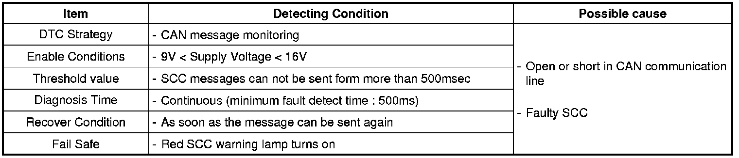 SCC (Smart Cruise Control) has additional function which helps to keep safety distance from the car ahead as compared with conventional ACC (Auto Cruise Control). SCC uses CAN communition to exchange information, which is required for control, with related ECUs and to receive input signal from SCC remote control switch and to transmit output signal to cluster. CAN communication type is communication speed is high speed CAN and two terminal resistance (120 Ohms) is connected in a line. SCC has a CAN controller to control signal exchange.