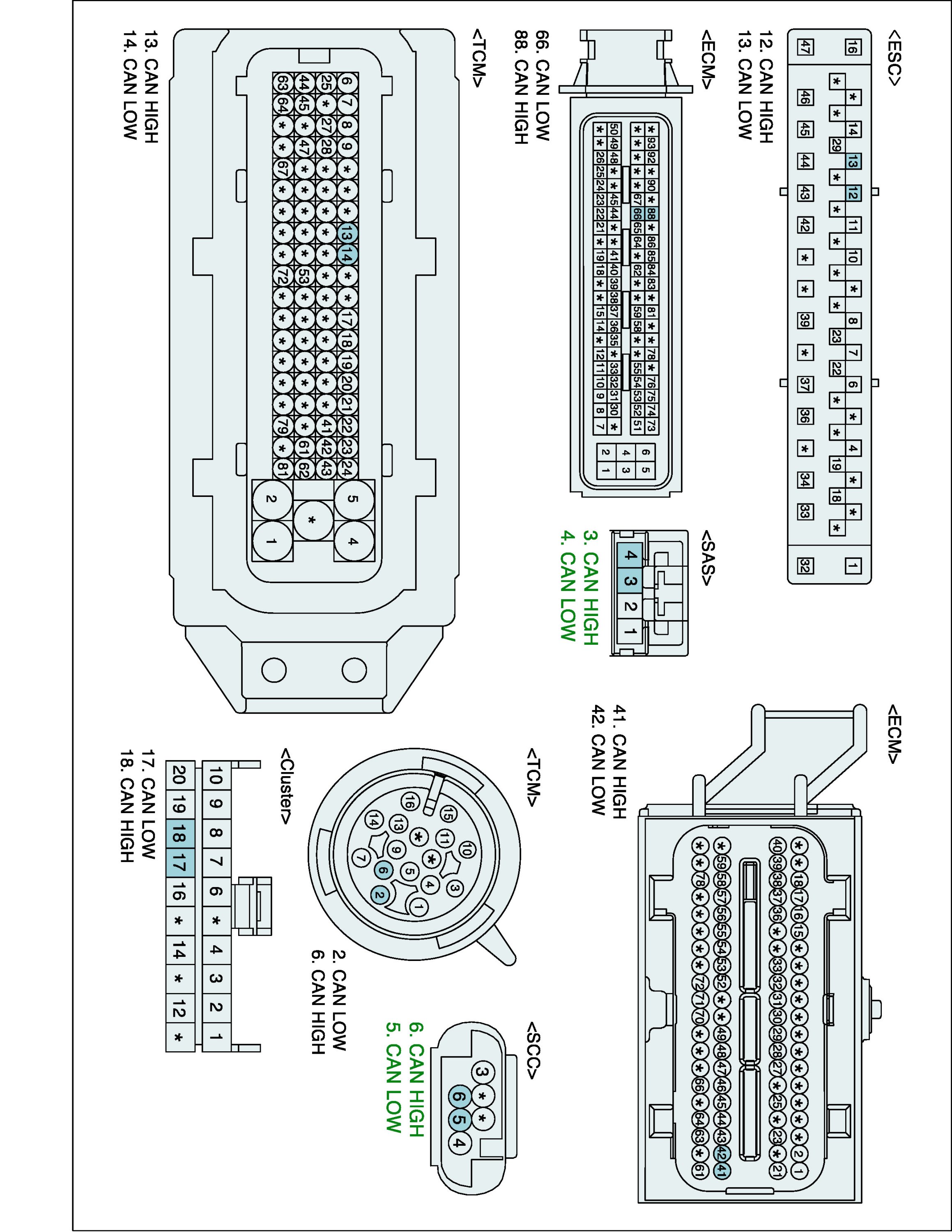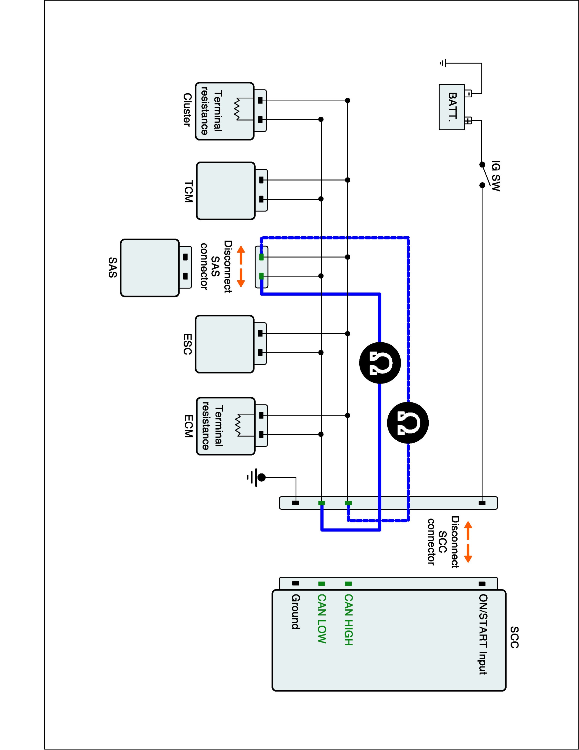 2. Check resistance between CAN-HIGH terminal of SAS harness Connector and CAN-HIGH terminal of SCC harness Connector. (CAN HIGH line)