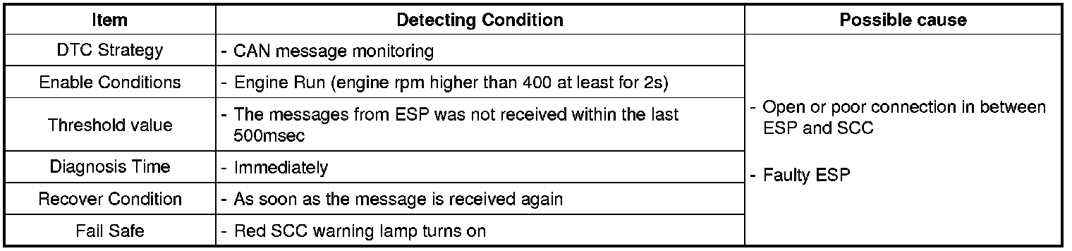 SCC sets this code when the messages from ESP was not received within the last 500msec. System recovers to normal state if the message is received again.