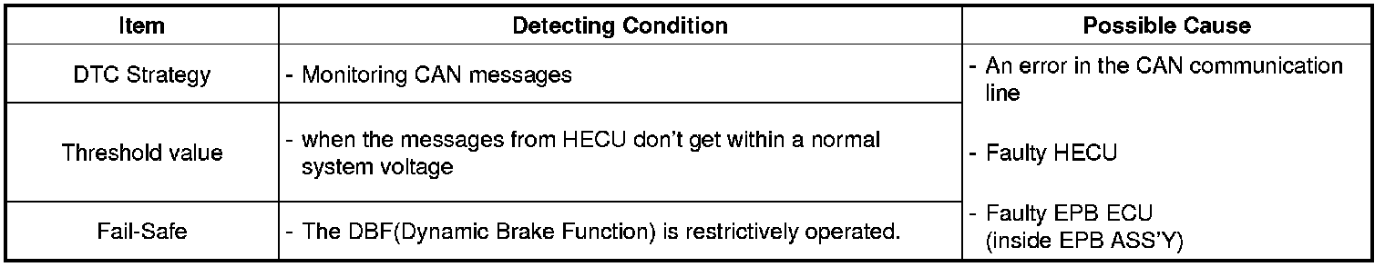 The EPB ECU checks CAN communication circuit for a normal operation and if the messages from HECU do not receive for a certain time, this DTC is set.