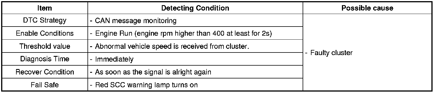 SCC monitors vehicle speed signal from cluster with every reception of the CAN message. SCC sets this code when abnormal vehicle speed is received from cluster. System recovers to normal condition as soon as the signal is alright again.