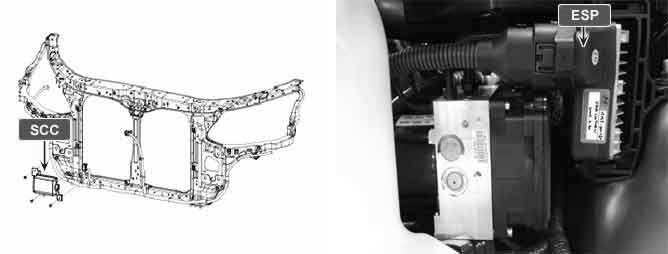 SCC (Smart Cruise Control) has additional function which helps to keep safety distance from the car ahead as compared with conventional ACC (Auto Cruise Control). SCC uses CAN communition to exchange information, which is required for control, with related ECUs and to receive input signal from SCC remote control switch and to transmit output signal to cluster. CAN communication type is communication speed is high speed CAN and two terminal resistance (120 Ohms) is connected in a line. SCC has a CAN controller to control signal exchange.