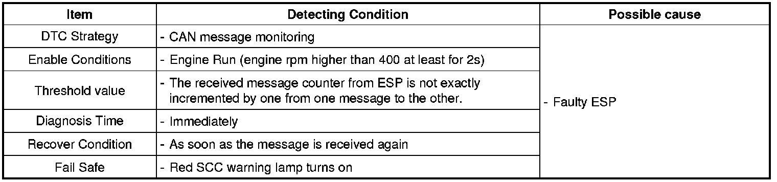 SCC monitors message counter from ESP with every reception of the CAN message. SCC sets this code when the received message counter from ESP is not exactly incremented by one from one message to the other. System recovers to normal condition as soon as the message counter is alright again.