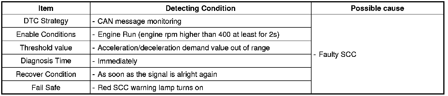 ESP ECU monitors acceleration/deceleration demand value received from SCC. In case of the value out of range, ESP ECU transmits a message, which represents acceleration/deceleration request value out of range, to SCC. SCC sets this code when this message from ESP ECU is received. System recovers to normal condition as soon as the signal is alright again.