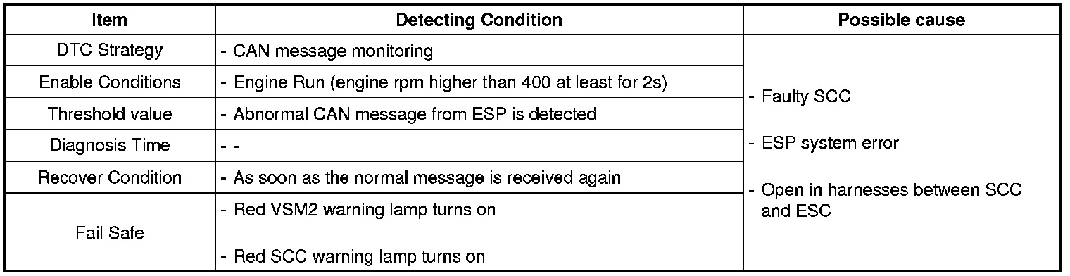 SCC monitors CAN messages from ESP. SCC sets this code when abnormal message is received from ESP. System recovers to normal condition as soon as the signal is alright again.