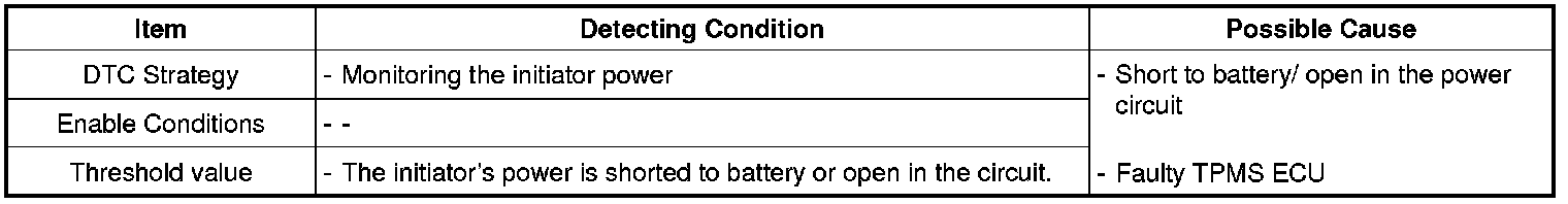 The TPMS ECU monitors the power of initiator and if it is detected as a short circuit to battery or an open in the circuit, this DTC is set.