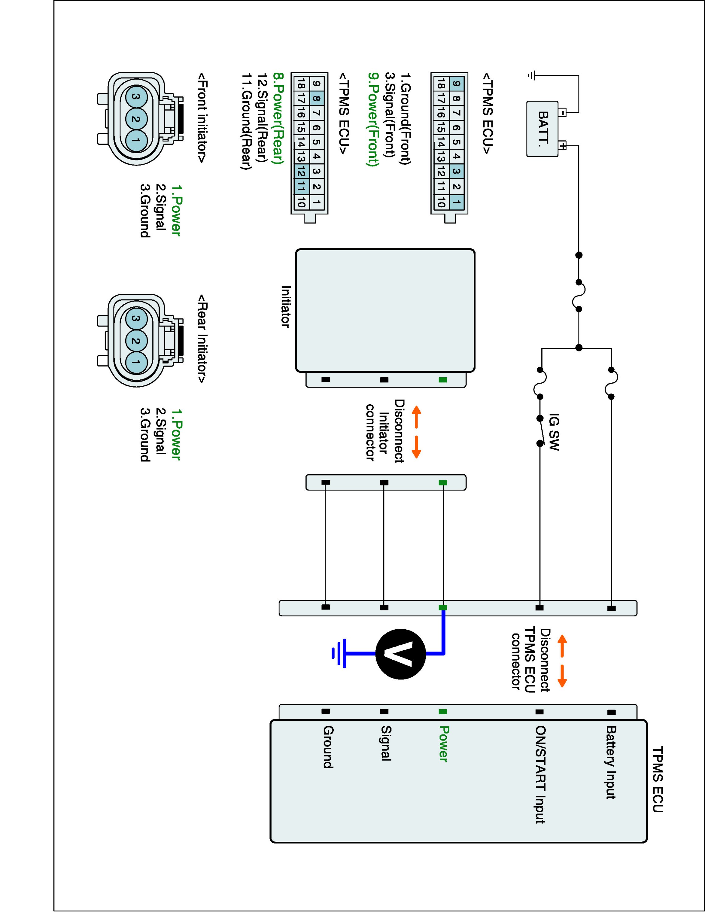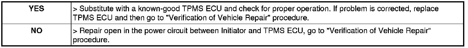 4. Measure voltage between initiator's power terminal of TPMS ECU harness connector and chassis ground.