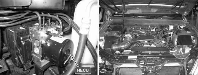 The HECU (Hydraulic and Electronic Control Unit) is one body of the ECU (Electronic Control Unit) and HCU (Hydraulic Control Unit). The HCU consists of an accumulator, a return pump and solenoid valve assay. The increasing,maintaining and decreasing of brake pressure to each wheel cylinder is done by the electronic motor. And the brake pressure in accordance with the control logic is supplied by the pump on the basis of wheel speed sensor's signal.