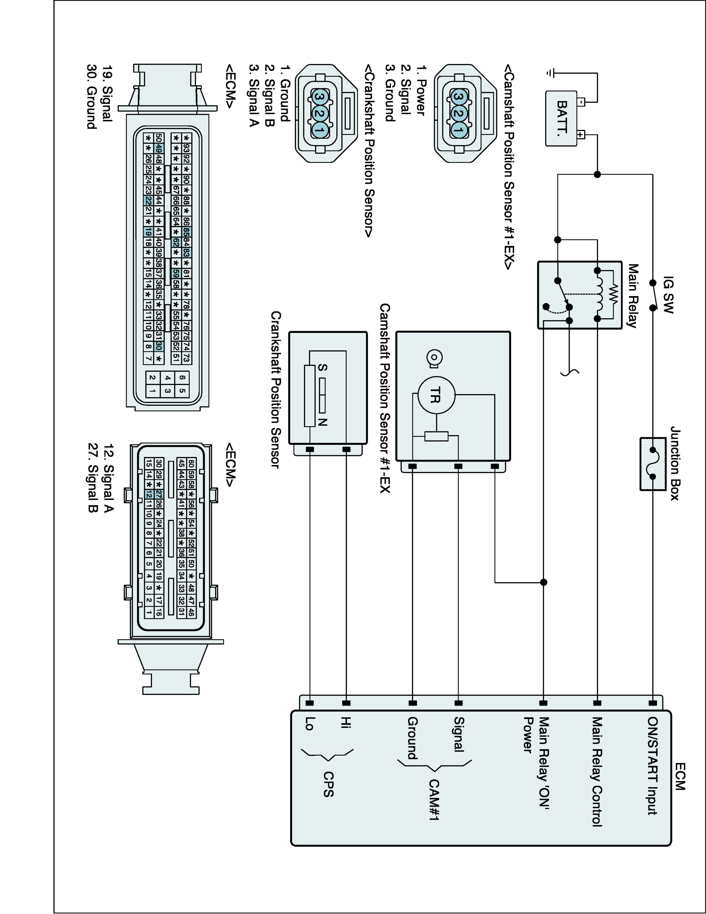 Camshaft Position Sensor (CMPS) is a hall sensor and detects the camshaft position by using a hall element. It is related with Crankshaft Position Sensor (CKPS) and detects the piston position of the each cylinder which the CKPS can't detect. This CMPS signal is sent to the PCM and it uses CMPS signals for determining the ignition timing with CKPS signals. CMPS makes Sequential Injection possible.