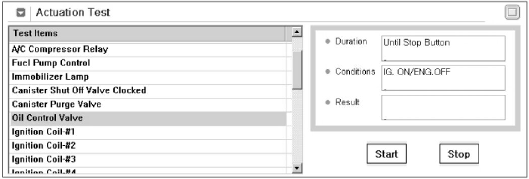 2. Select "OIL CONTROL VALVE" on the Actuation Test