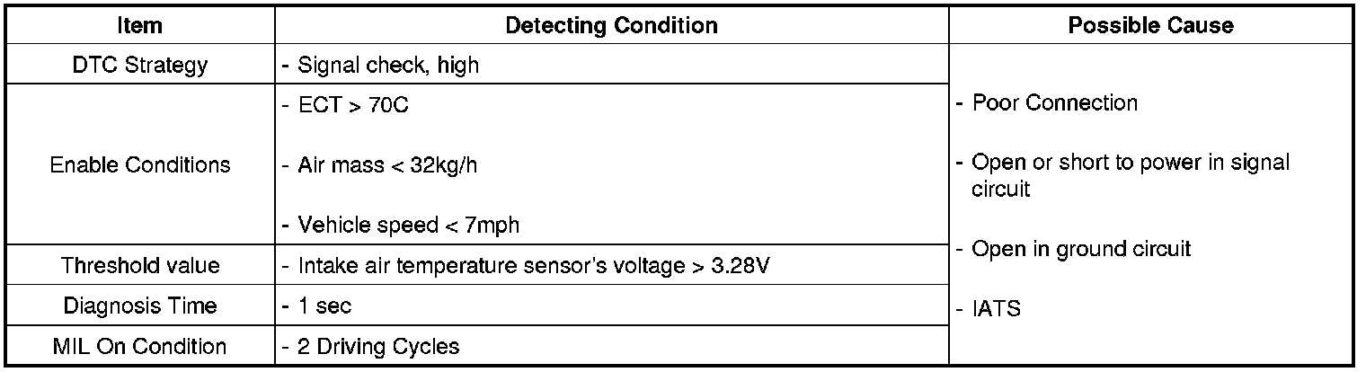 If measured temperature is lower than the minimum threshold value during 1 sec, ECM sets DTC P0113.