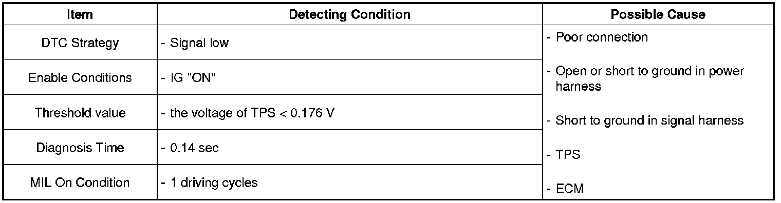 If the sensor input voltage is lower than the minimum threshold value during 0.14 sec under normal driving condition, ECM sets DTC P0122.