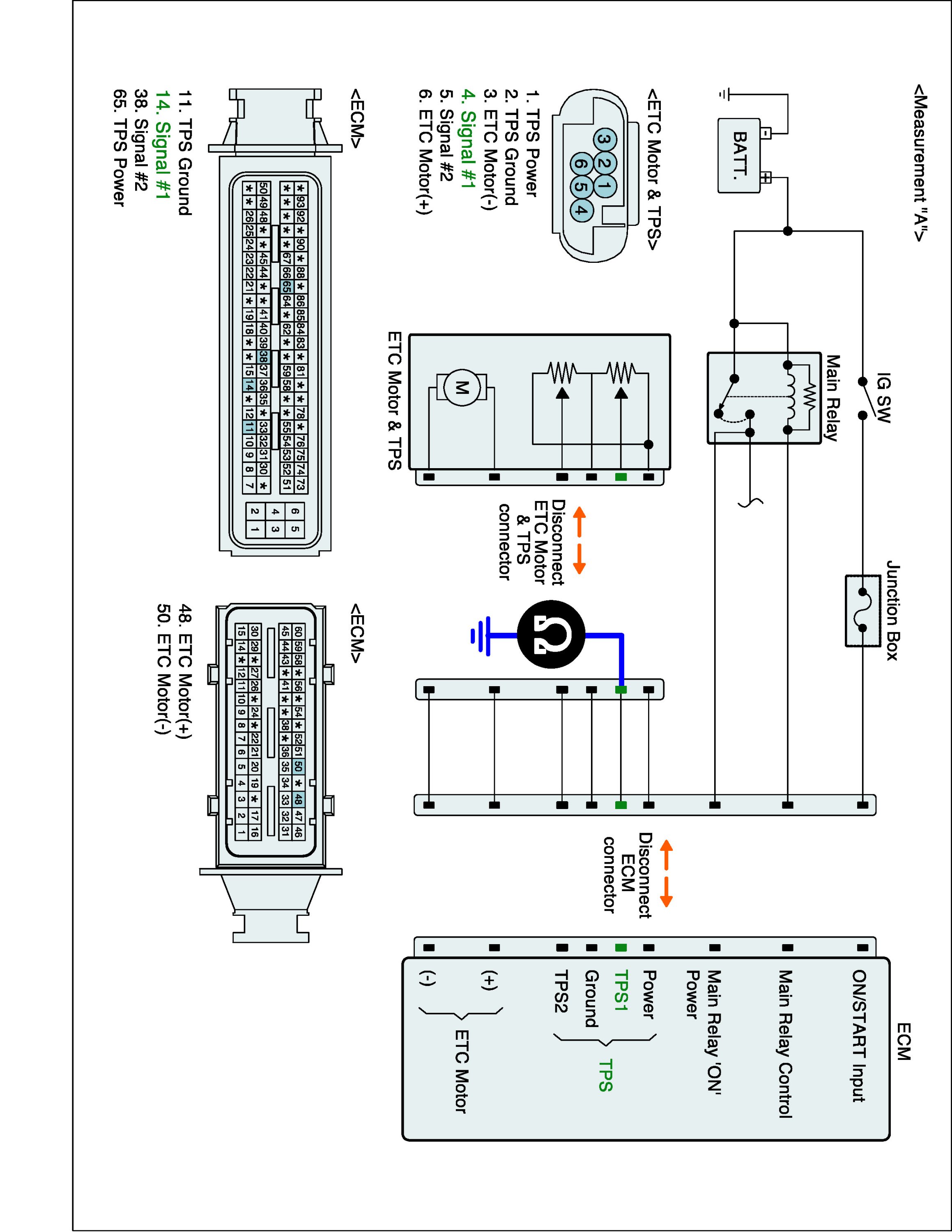 2. Measure resistance between TPS 1 signal terminal of ETC Motor & TPS harness connector and chassis ground. (Measurement "A")