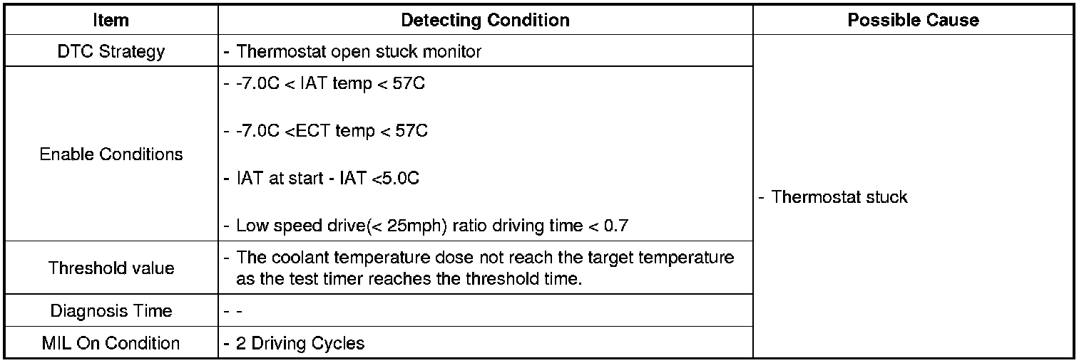 Checking time and coolant temperature under detecting condition, if the coolant temperature dose not reach the target temperature as the test timer reaches the threshold time, ECM sets P0128.