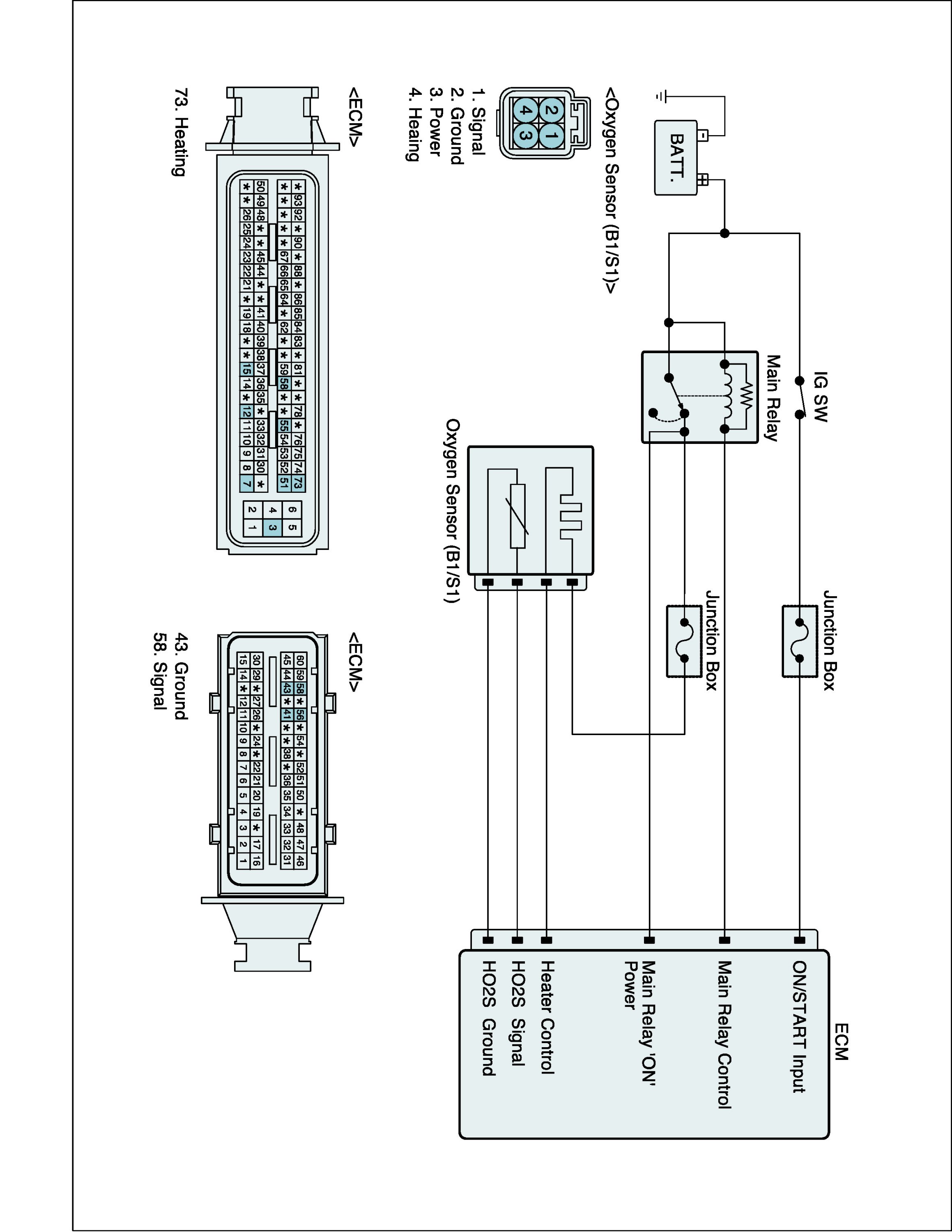 In order to control emissions of the CO, HC and NOx components of the exhaust gas, heated oxygen sensor (HO2S), mounted on the front side and rear side of catalytic converter, detects the oxygen content in the exhaust gas. The front HO2S signal is used to control air/fuel ratio (closed loop fuel control) and the rear HO2S signal is used to monitor front HO2S and catalyst for proper operation. The HO2S requires a minimum temperature to operate properly and provide a closed loop fuel control system. The HO2S contains the heater element to reduce its warming-up time and ensure its performance during all driving conditions. The oxygen sensor generates a voltage that indicates the difference between the oxygen content of the exhaust stream and the oxygen content of ambient air. When the exhaust stream is "rich," there is more oxygen in the ambient air than in the exhaust stream, so the voltage will be higher.